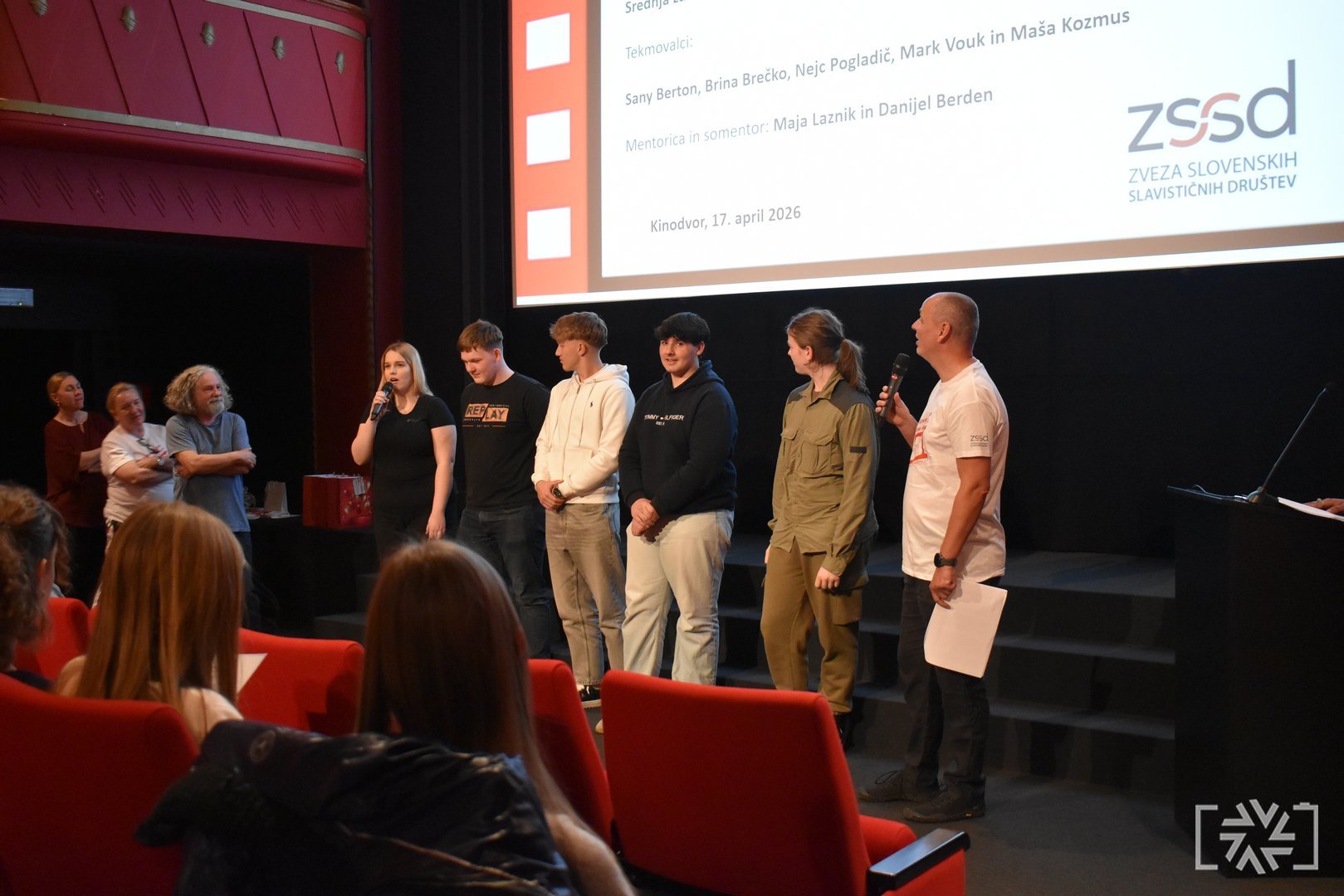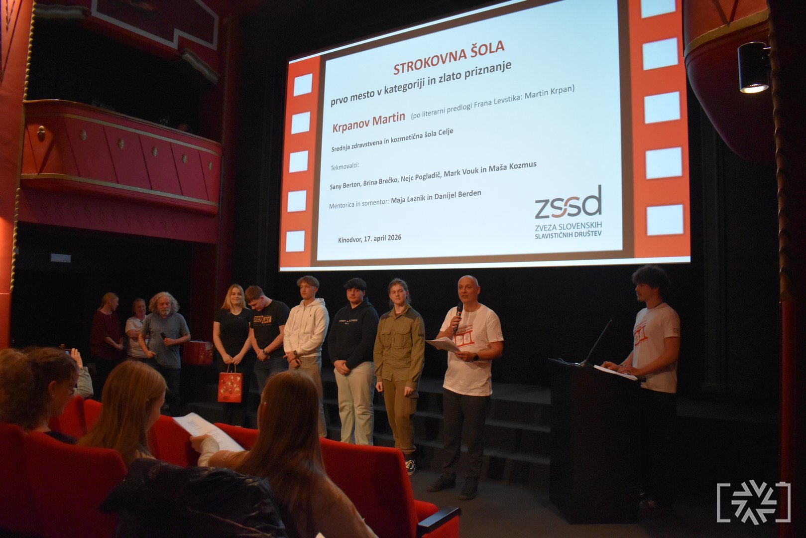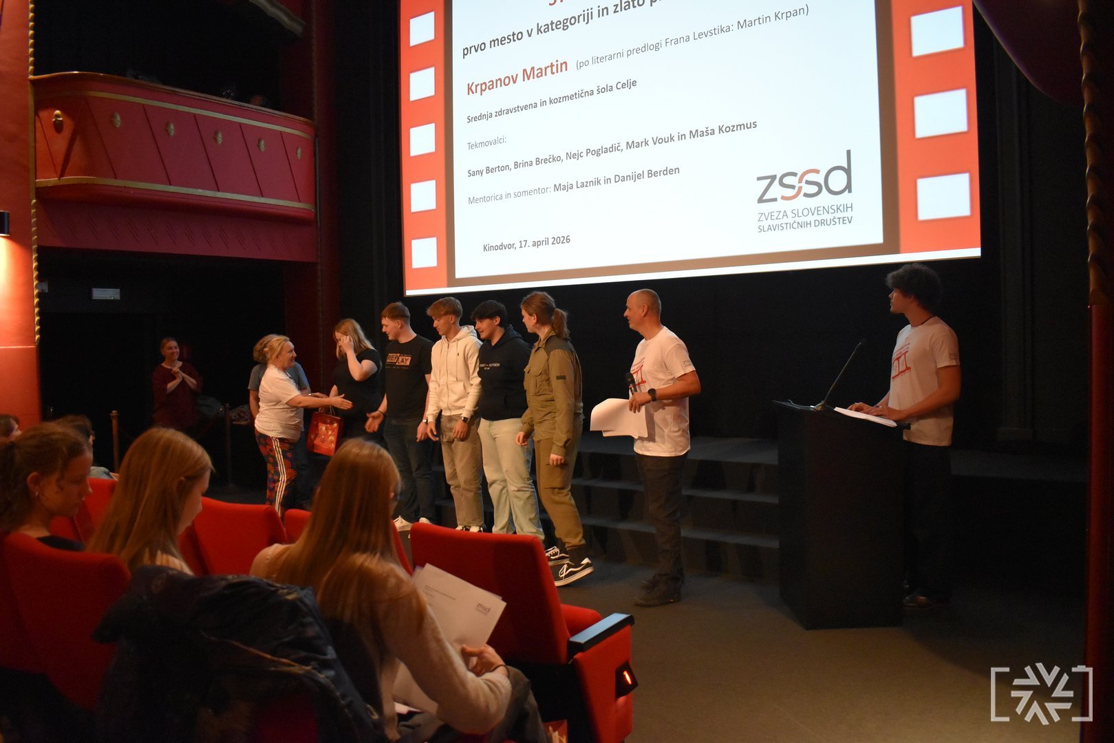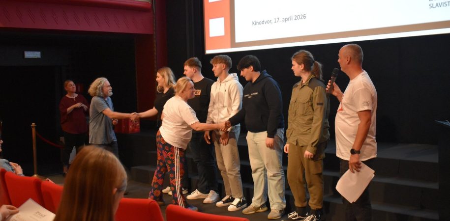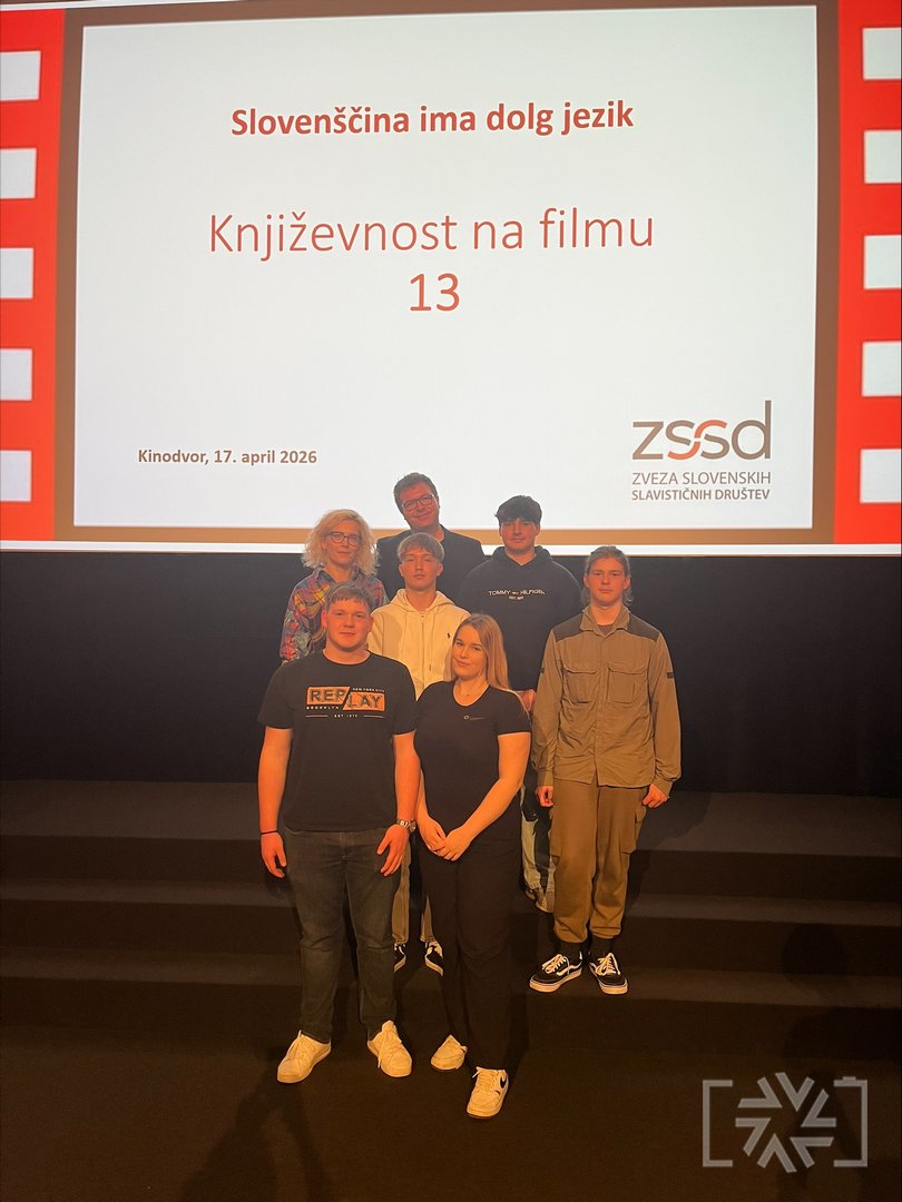 V petek, 17. aprila 2026, je v Kinodvoru v Ljubljani potekala slavnostna podelitev priznanj s tekmovanja Slovenščina ima dolg jezik – Književnost na filmu 13. Podelitve smo se udeležili učenci, dijaki in mentorji tekmovalnih skupin, ki so prejele zlata in srebrna priznanja. V dvournem programu smo si ogledali vse nagrajene filme ter še posebej ponosno stopili na oder, kjer smo prejeli zlato priznanje. Motivirani za delo v prihodnje smo se odločili, da se zagotovo še vrnemo.