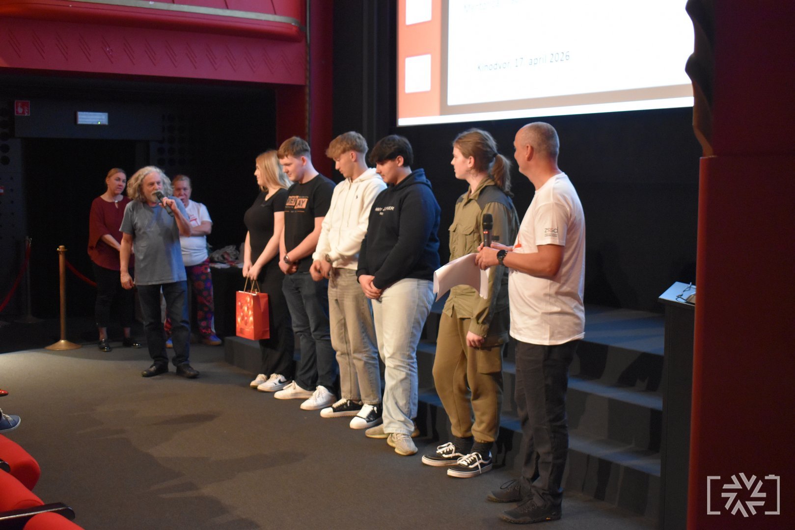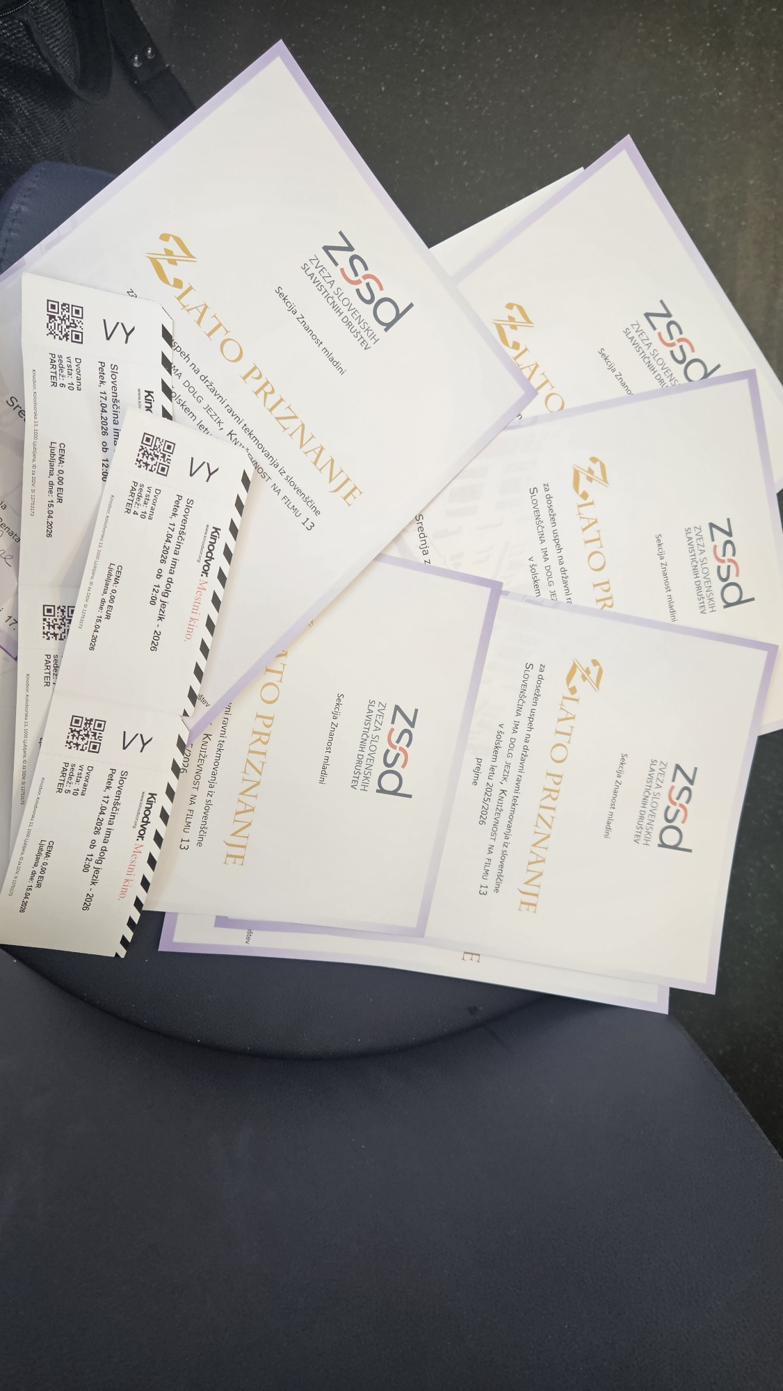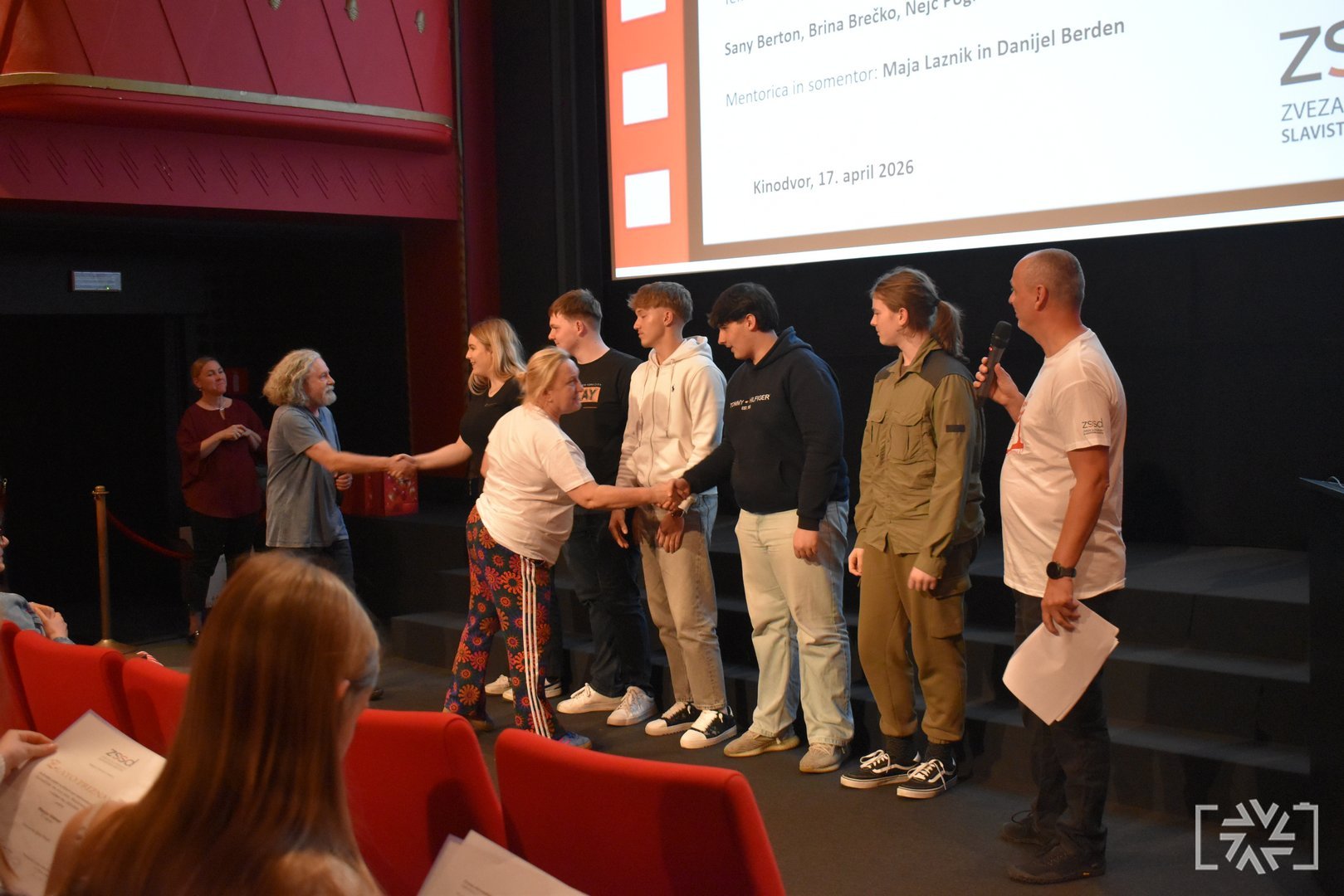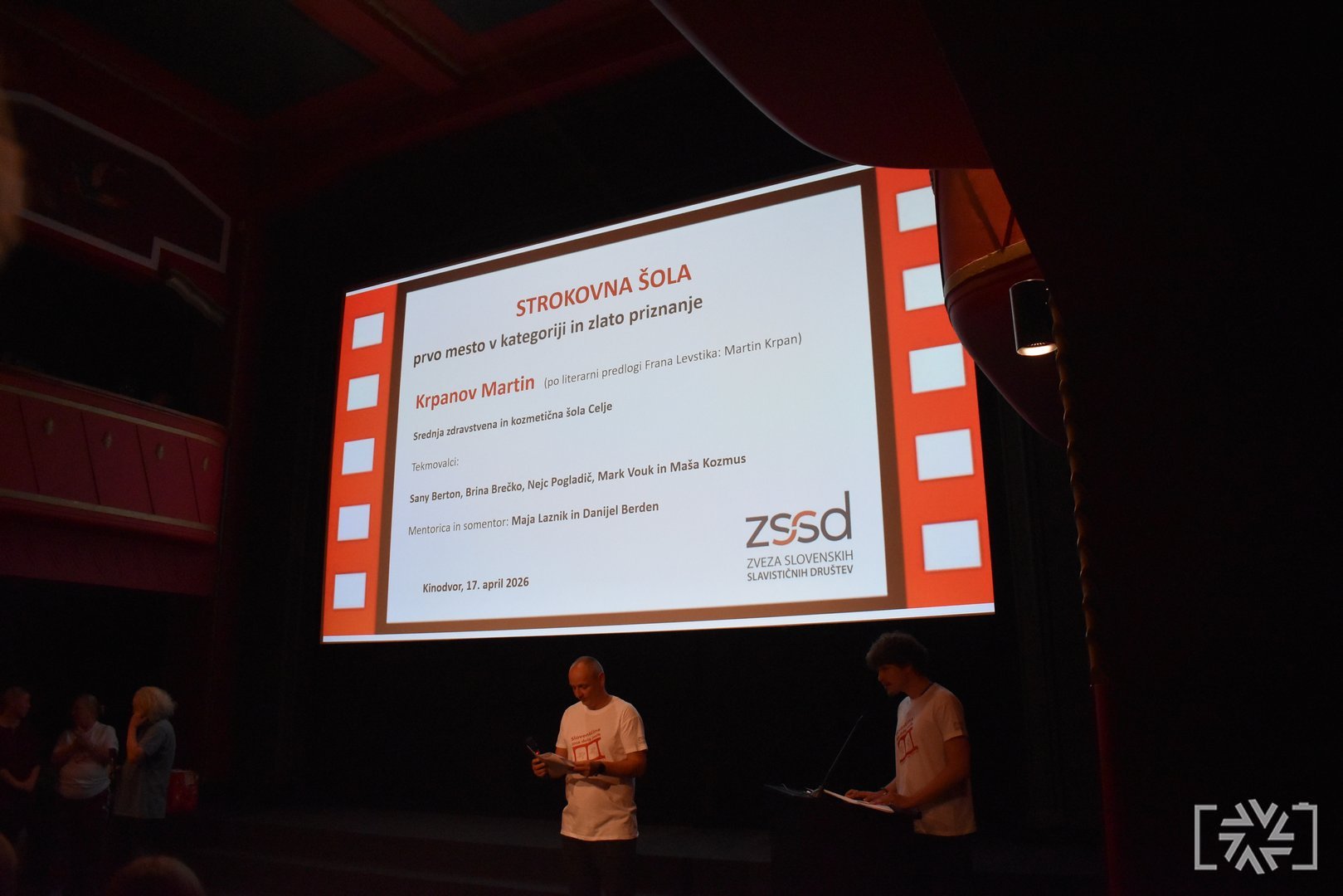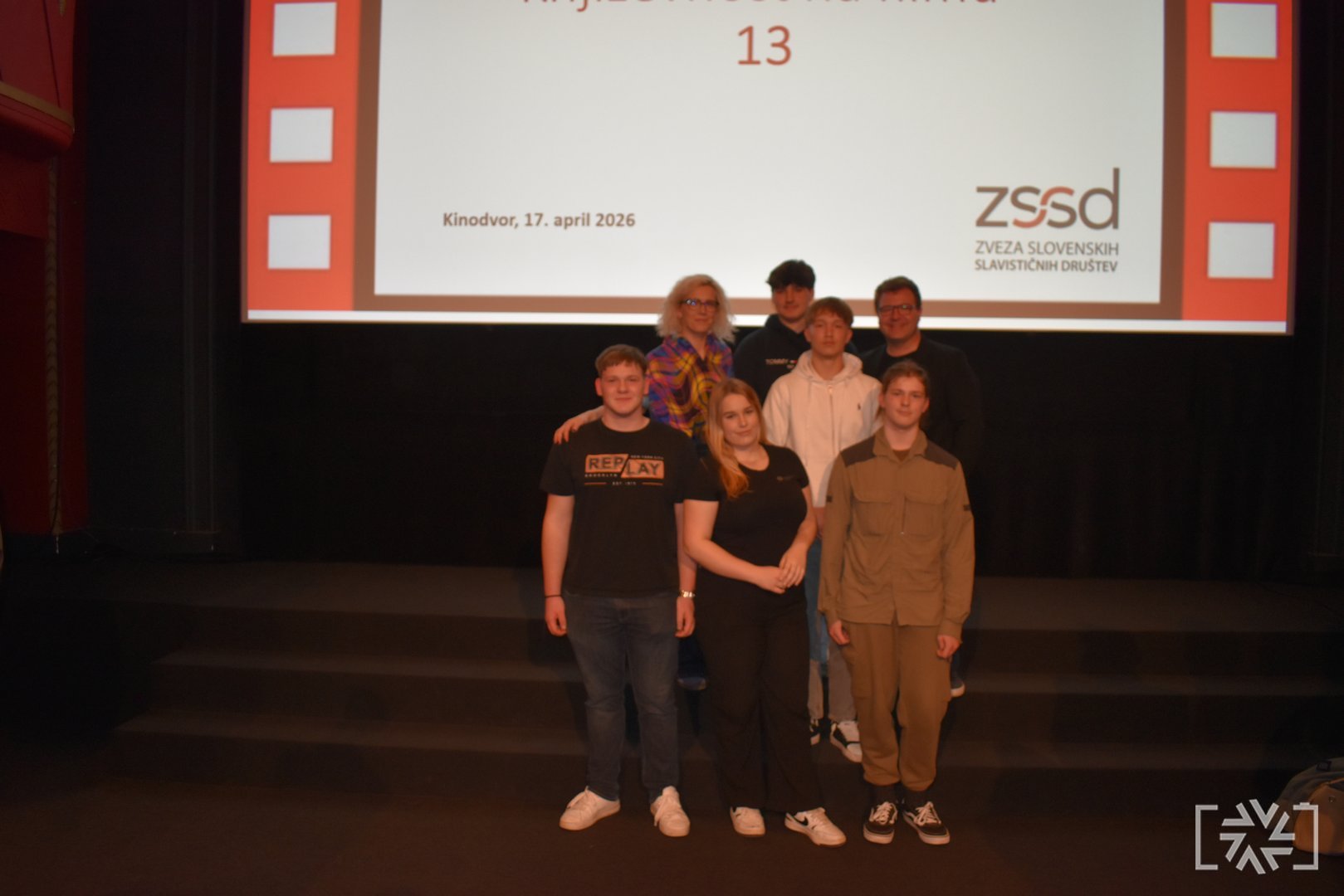 V petek, 17. aprila 2026, je v Kinodvoru v Ljubljani potekala slavnostna podelitev priznanj s tekmovanja Slovenščina ima dolg jezik – Književnost na filmu 13. Podelitve smo se udeležili učenci, dijaki in mentorji tekmovalnih skupin, ki so prejele zlata in srebrna priznanja. V dvournem programu smo si ogledali vse nagrajene filme ter še posebej ponosno stopili na oder, kjer smo prejeli zlato priznanje. Motivirani za delo v prihodnje smo se odločili, da se zagotovo še vrnemo.